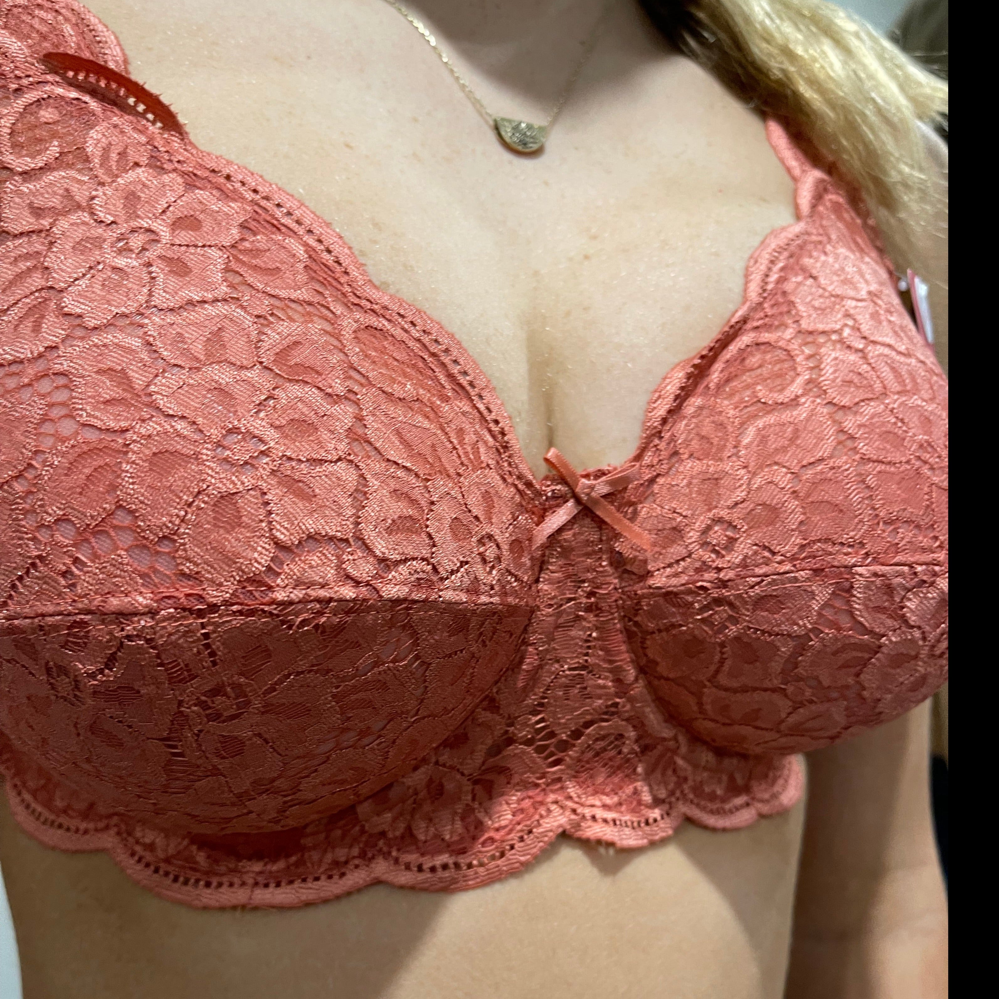 The Caprice Lily Bra is a three section, lace cup, underwire bra with a wider top panel and straps, and a deeper band under the rib cage. A popular style in a pretty Cinnamon Ideal for a bust that has a full undercup but lost some elasticity in the top.