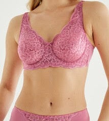 The Caprice Lily Bra is a three section, lace cup, underwire bra with a wider top panel and straps, and a deeper band under the rib cage. A popular style in a pretty Blush Pink. Ideal for a bust that has a full undercup but lost some elasticity in the top.