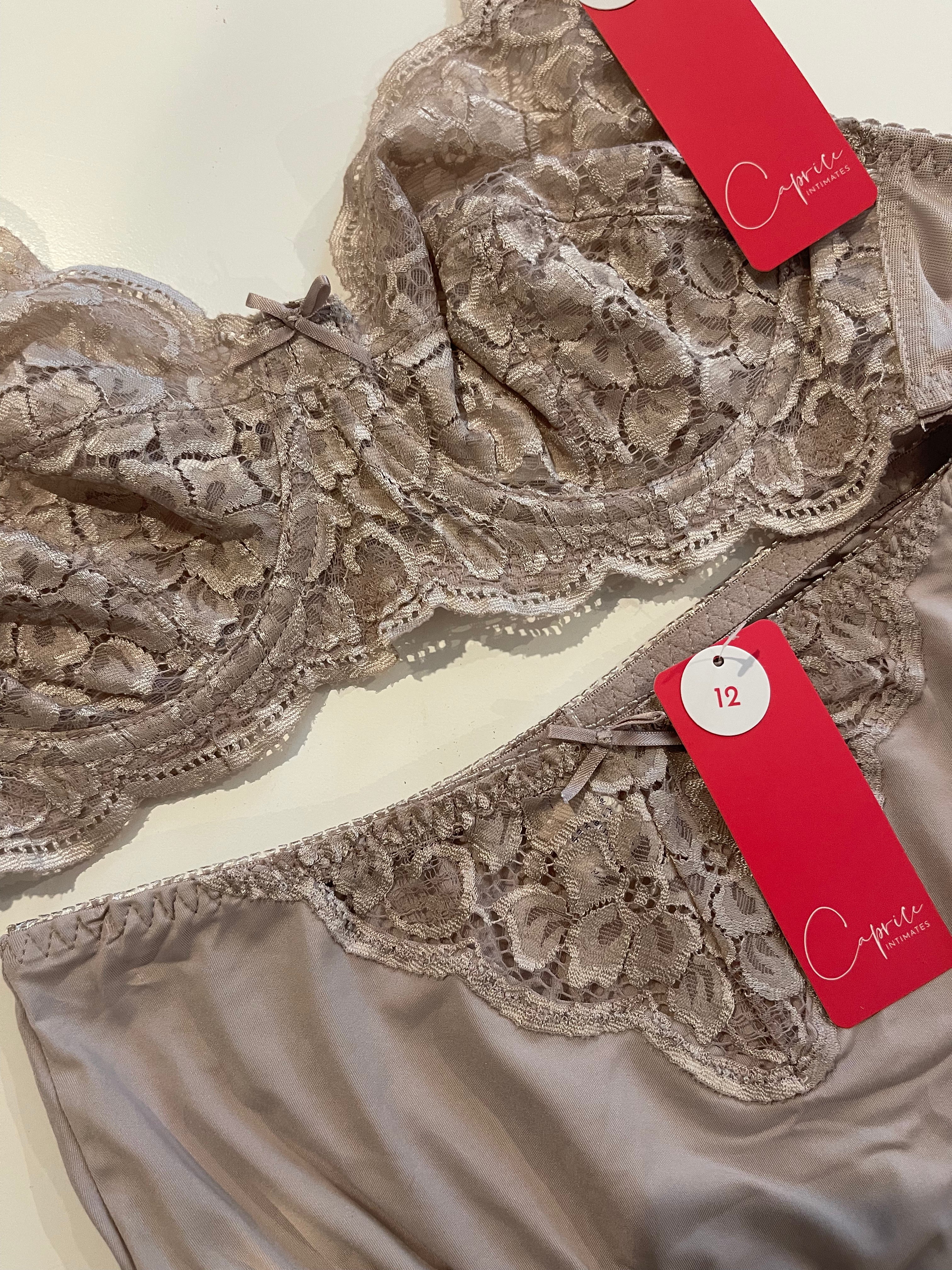 The Caprice Lily Bra is a three section, lace cup, underwire bra with a wider top panel and straps, and a deeper band under the rib cage. A popular style in a pretty Blush Pink. Ideal for a bust that has a full undercup but lost some elasticity in the top.