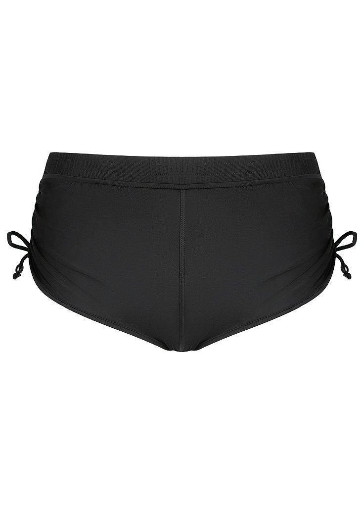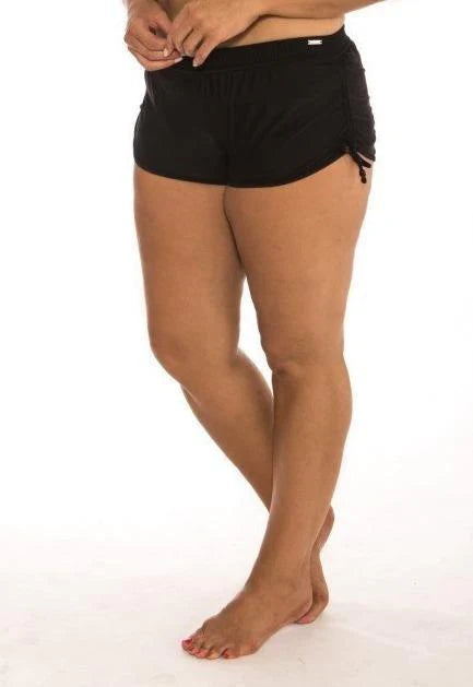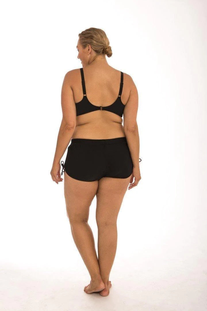 The Plain Black Adjustable Side Short a sporty and athletic bathing suit bottom perfect for any water sport, splashing in the waves or for any woman seeking fuller coverage in a swimsuit bottom. This bather pant is a comfortable, relaxed and casual style that offers a festive and cute style to any outfit.