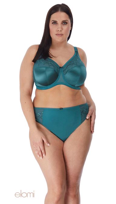 Call the shots with confidence in the Cate Brief, returning in a stunning Teal colourway. A real Elomi classic, this collection offers incomparable comfort and support all day long. This brief is cut from a smooth stretch fabric with a subtle sheen and teamed with sheer embroidery side panels for a modern touch to a classic collection. Matching brief for Cate bra in Teal EL4030TEL.