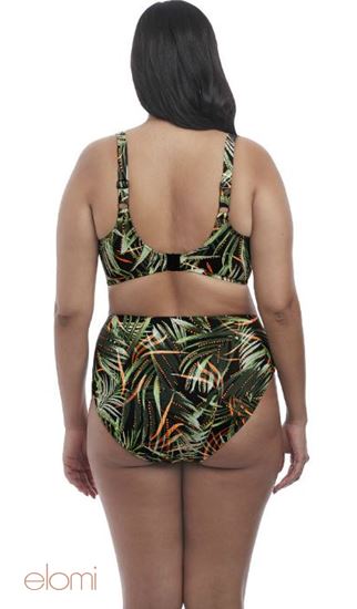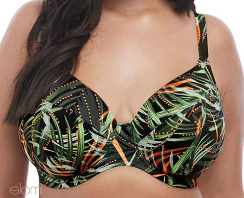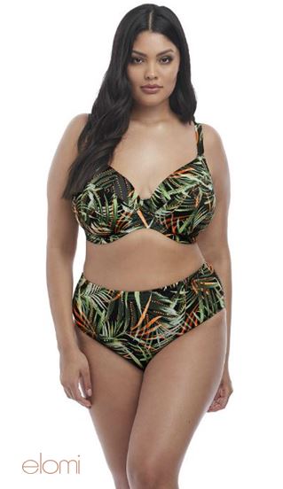 Electrify your poolside look with Amazonia. This collection's jungle-at-night print features shades of khaki green on a black background with arcs of firefly-like orange dots. This gorgeous bikini top offers fully printed cups, straps and back cut from a lightweight printed fabric, a neckline that has concealed elastic for ease of fit, fully lined with a light but supportive fabric for a bikini look with the fit of an Elomi lingerie bra with adjustable length straps and powernet back lining for extra support. Matching Amazonia swim brief ES7165 and ES7166.