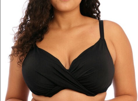 Magnetic updates classic Elomi Swim styles with high fashion touches. Details include flattering twist front designs, strapping details and ‘barely there’ flesh tone panelling. Available in timeless Black. Based on the Essentials ES7504 UW Plunge Bikini Top with the addition of a gathered wrap overlay at the centre front. Featuring a neckline that has concealed elastic for ease of fit, powernet back lining for extra support and fully lined with a light but supportive fabric for a bikini look with the fit of an Elomi Lingerie bra. Matching Magnetic swim brief ES7195BLK and ES7196BLK