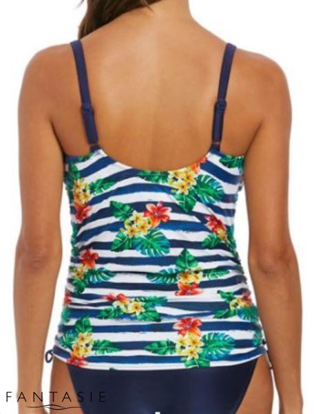 Chic navy and white stripes are paired with lush hyper real florals to create Porto's spirited take on all things nautical. With a range of swim styles and coverage levels to choose from, there's something for everyone this bold collection. This gorgeous tankini offers light padded foam cups for a smooth rounded profile, powernet lined wings for support and anchorage, adjustable tie sides for variation of body length, ruched body to flatter the tummy area, conceal underwire for support, concealed inner hook and eye for support and control and fixed fully adjustable shoulder straps. Also available in the Porto collection Bikini Top FS6670 and Swim Brief FS6676.