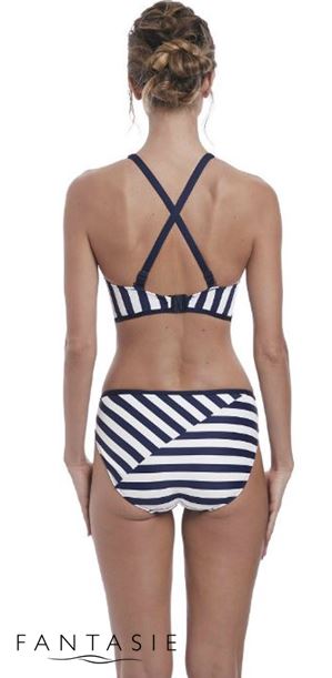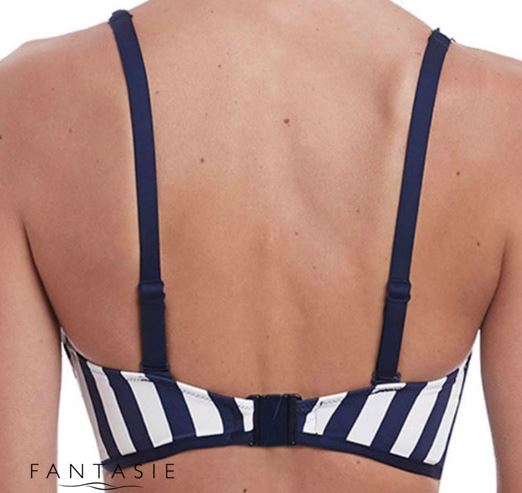 A contemporary take on all things nautical, Cote D'Azur features a flattering deep plunging neckline with gentle gathers under bust for shaping and a chic multi- directional stripe in ink and white. This gorgeous bikini top also offers a powernet lined deep wing and wide clasp for support and anchorage, fully adjustable, convertible straps that allow for cross back and over the shoulder and metallic copper button detailing at the centre front that will not heat up in the sun. Also available in the Cote D'Azur collection Swim Briefs FS6746 and FS6747