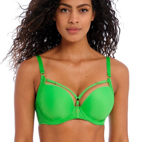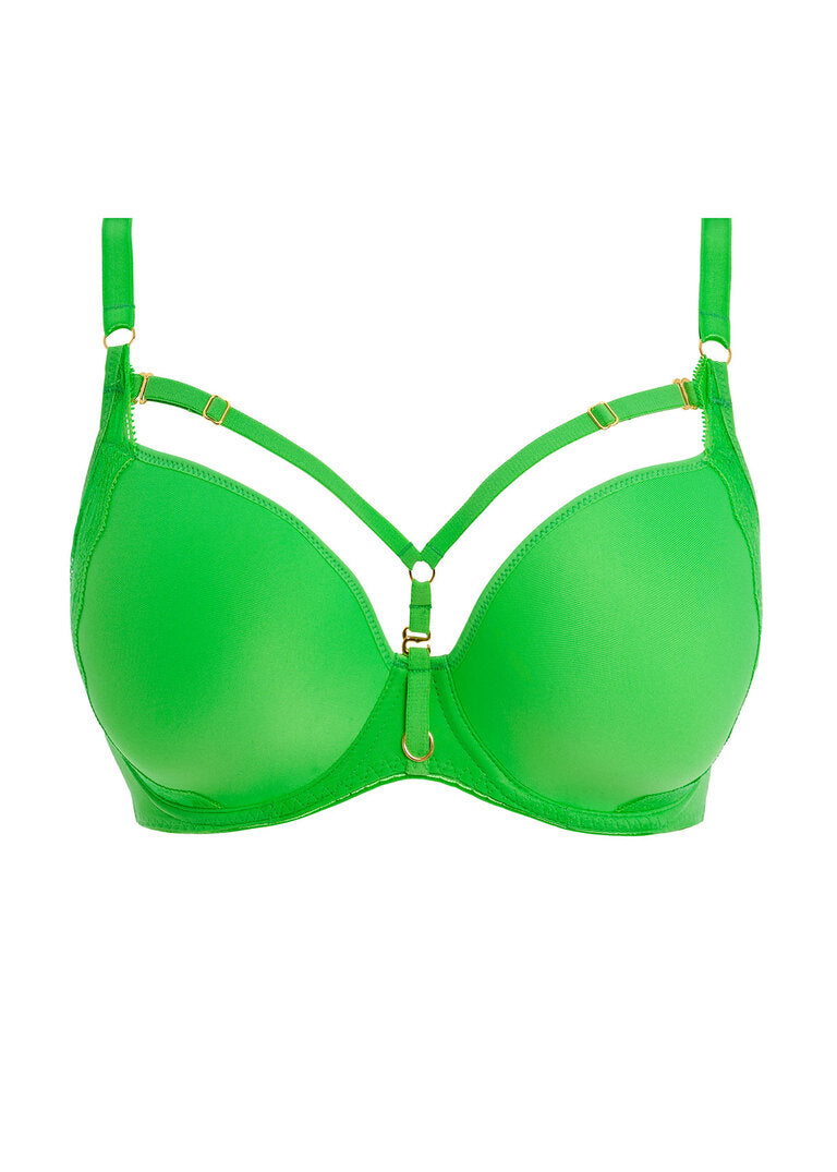 Make a statement in Freya's Temptress Moulded Plunge Bra in Poison Green a colourway so fabulous it deserves to be seen. This design features a low centre front that offers the desired cleavage without overspill and detachable, adjustable strapping detailing at the centre front, elegantly finished with gold rings and slides.