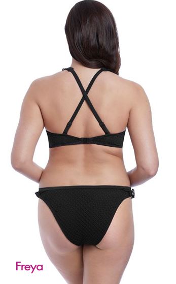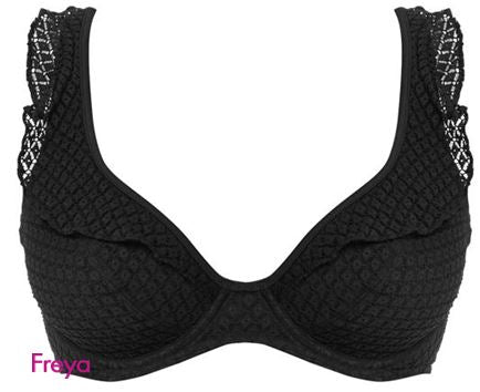 Discover boho chic with Freya’s classic Bohemia collection. The High Apex Bikini Top features a black crochet overlay and a plunging neckline that offers less coverage and an enhanced cleavage with a decorative frill for a unique swimwear look. Convertible straps allow the Bikini Top to be worn over the shoulder or in a cross back style.