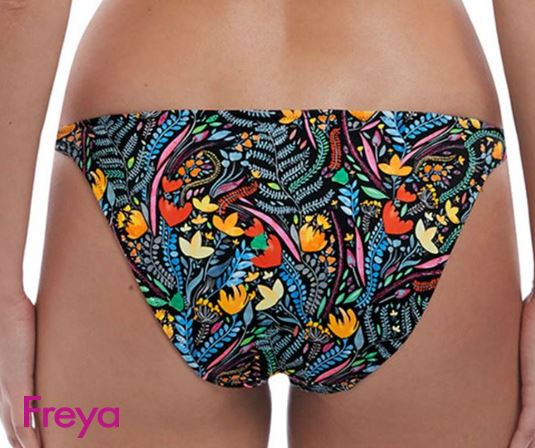 An enchanting swim collection, Modern Mystic's trailing botanical print pops against a black background in bold tones of azure blue, sunshine yellow and zesty green. This stunning tanga brief sits low on the hips with skimpy bottom coverage and narrow sides with gold ring detail at the front waist. Matching bikini top AS6832 and swim brief AS6833.