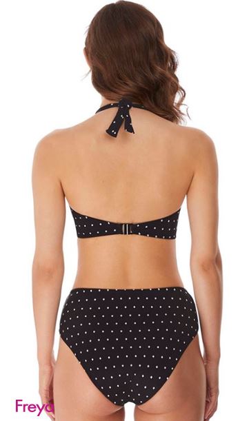 Poolside confidence is yours with Jewel Cove. A contemporary twist on a classic polka dot design, the repeat diamond print stretches across an Black ground. Based on the standard high waist brief shape but with a higher waist and scoop leg line with medium bottom coverage and concealed stitching for a clean, stitch free waist. Matching bikini top AS7230, swim briefs AS7235 and AS7237
