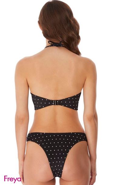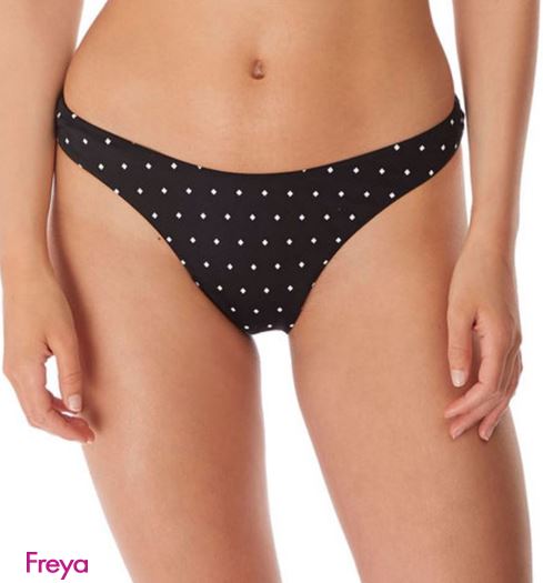 Poolside confidence is yours with Jewel Cove. A contemporary twist on a classic polka dot design, the repeat diamond print stretches across an Black ground. With dipped front and back waist, skimpy bottom coverage, a higher leg for reduced coverage and concealed stitching for clean, stitch free waist this brief is perfect for tanning and sits nicely up to a size 16. Matching bikini top AS7230, swim briefs AS7235 and AS7236.