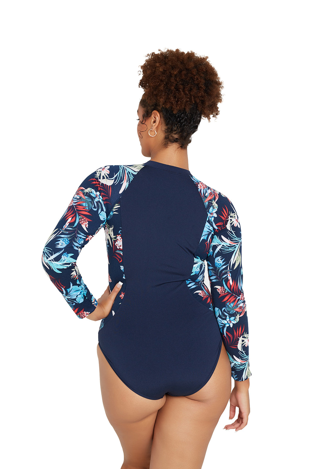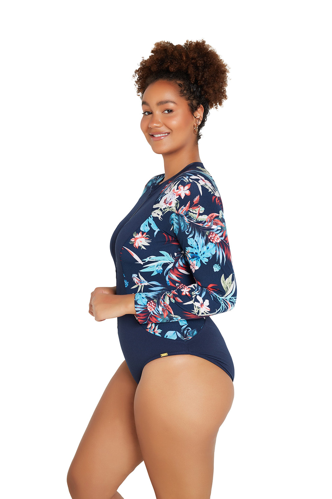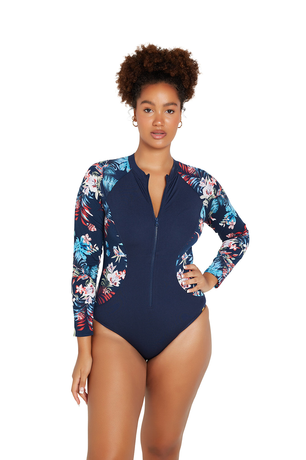At last, a pocketed chlorine resistant scuba suit with long sleeves in Botanica. With full zipper opening for ease of dressing. Cups are soft to prevent nipples from showing and are pocketed both sides.