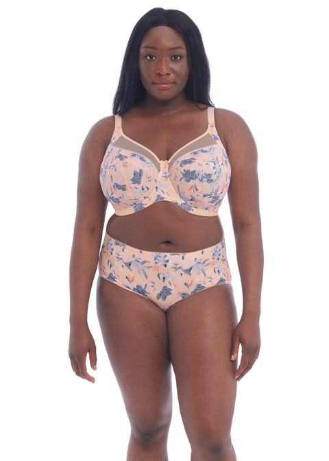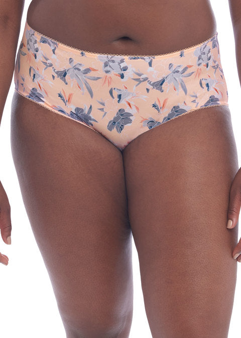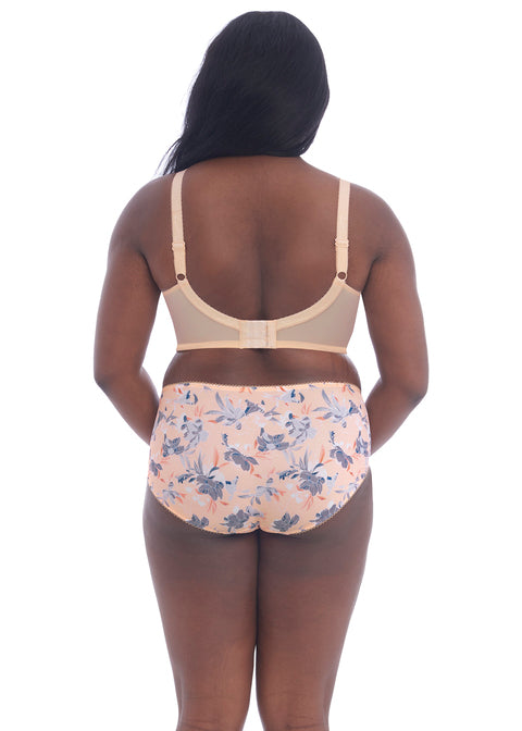 Goddess Serenity brief, features blue-gray flowers on a peach ground, silhouetted with white, hand-drawn outlines for a bright tri-layer look. Matching bra GD6162SNY for a beautiful set.