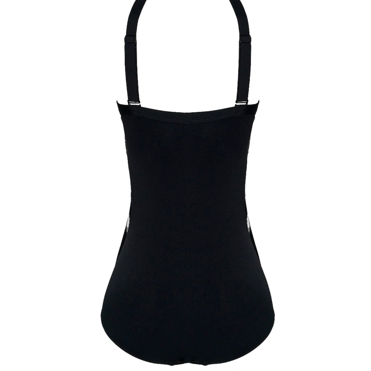 The swim dress has an integrated black swim bottoms and is flattering on all body shapes.