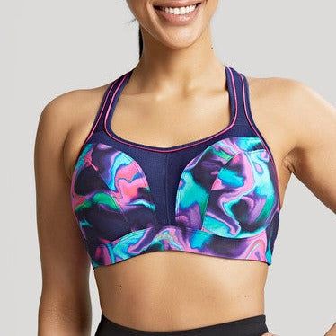 Introducing our bestselling sports bra in CYBER SWIRL. Panache’s 5021 allows for 83% less bounce with wide, supportive padded straps that disperse pressure from the shoulders for additional comfort, smooth moulded inner cups that reduce friction and improve comfort and underwires that are wrapped in silicone and sewn between the fabric layers for comfortable support. The outstanding light weight microfiber fabric wicks moisture away from the skin and breathable mesh panels keep skin cool.