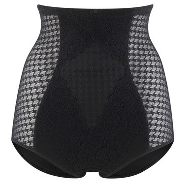 The Envy High Waist Shaping Brief in black is the perfect choice for creating a flattering shape under clothes. This style creates a beautiful look with a stretch floral lace centre panel, jacquard side panels and a mesh back with medium coverage. The high waist style cinches you in at the waist while the silicone elastic keeps a firm grip and prevents them from rolling.