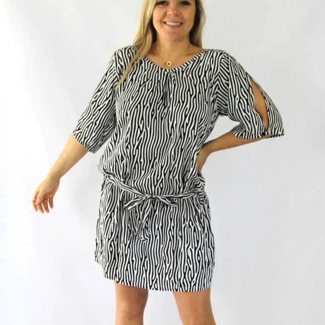 Made from a cool rayon with open sleeves and a matching fabric tie for around the waist this dress is perfect for summer.