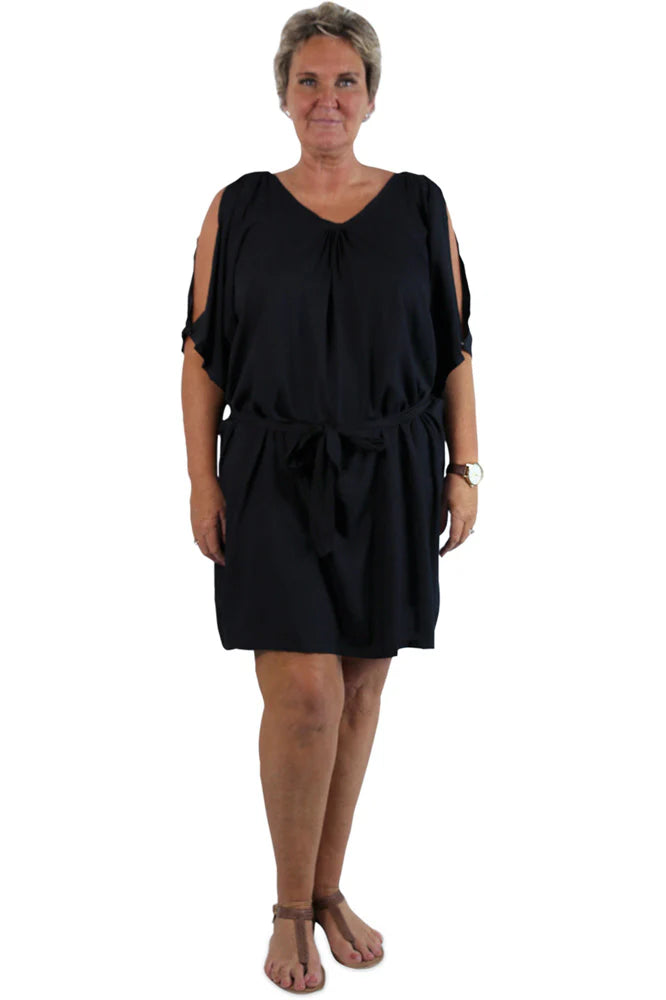 Made from a cool rayon with open sleeves and a matching fabric tie for around the waist this dress is perfect for summer.