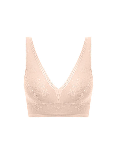 Net Effects, a contemporary easy wearing lace non-wired bralette. The perfect combination of both comfort and style, featuring a subtle floral embroidery with an irregular spot detail. Fitting up to a D/DD cup size.