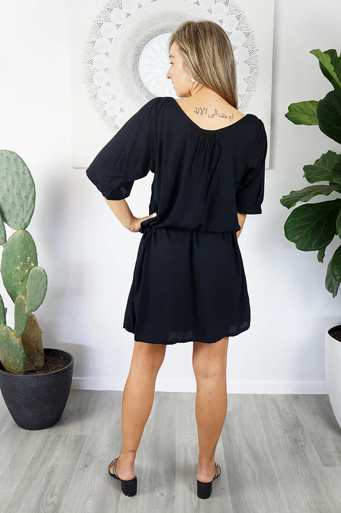 Made from a cool rayon with open sleeves and a matching fabric tie for around the waist this dress is perfect for summer.