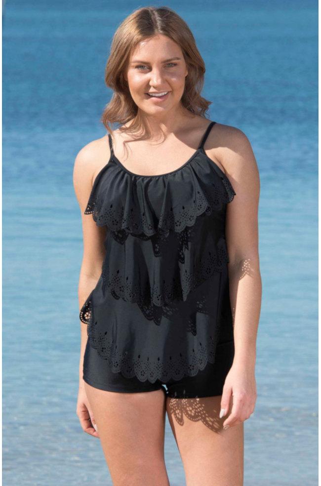 Laser Cut Ruffle Tankini Top by LaSculpte in classic black features a ruffled front with comfortable moulded cups. Back power mesh to shape your back.